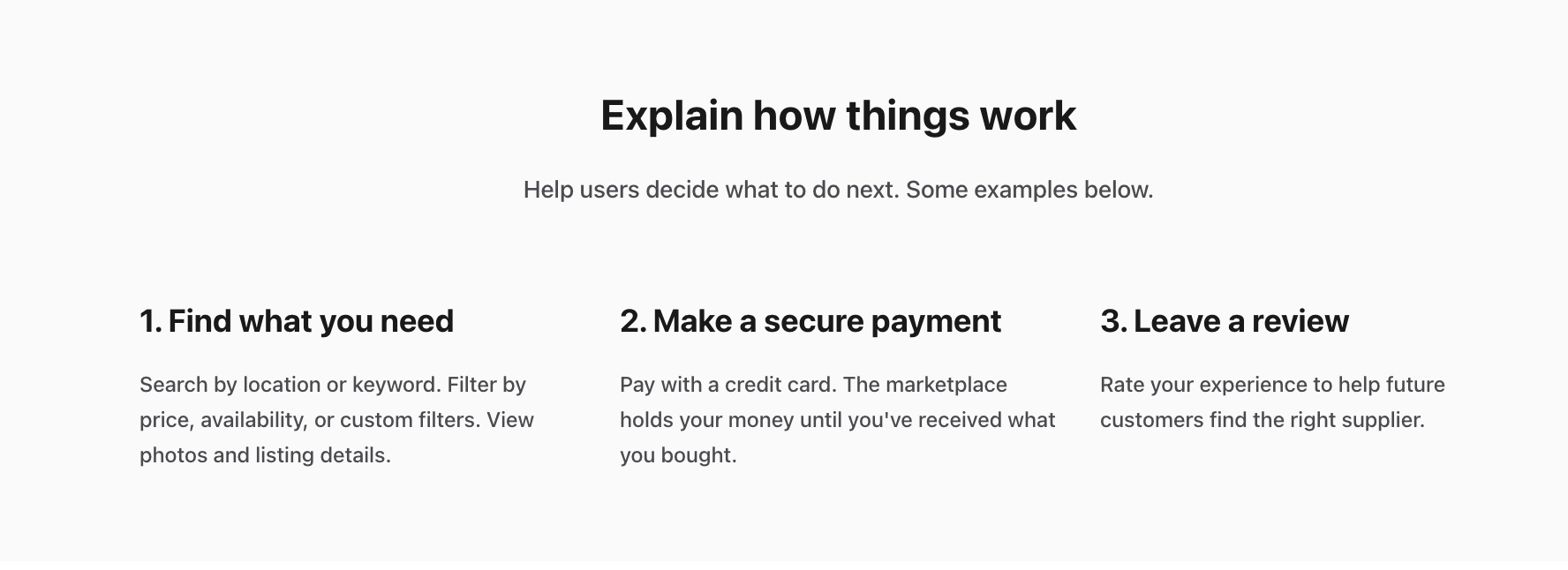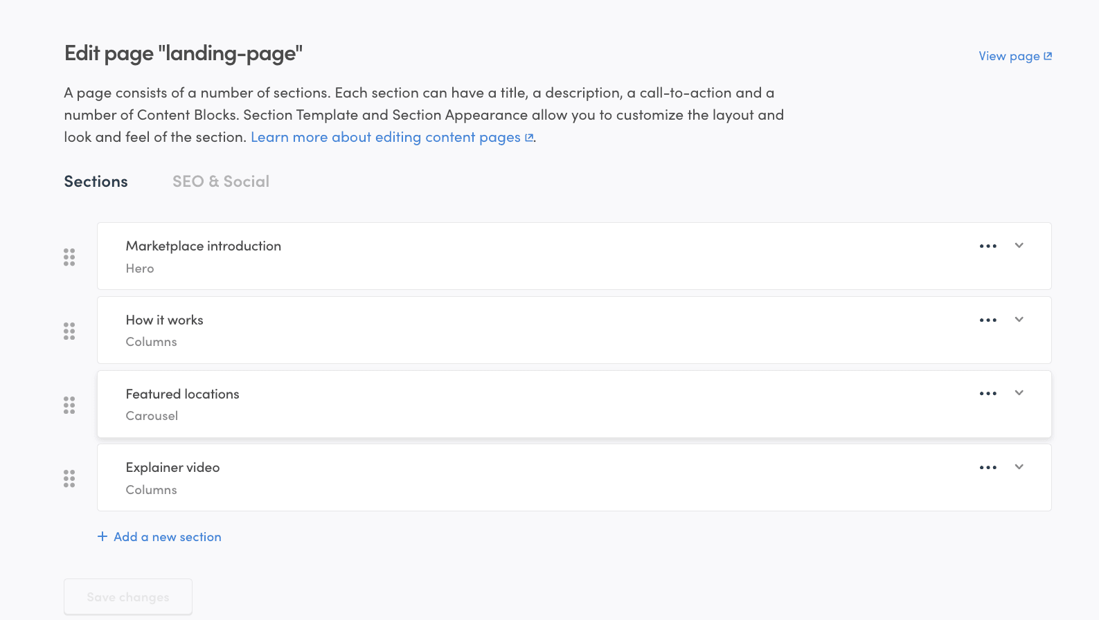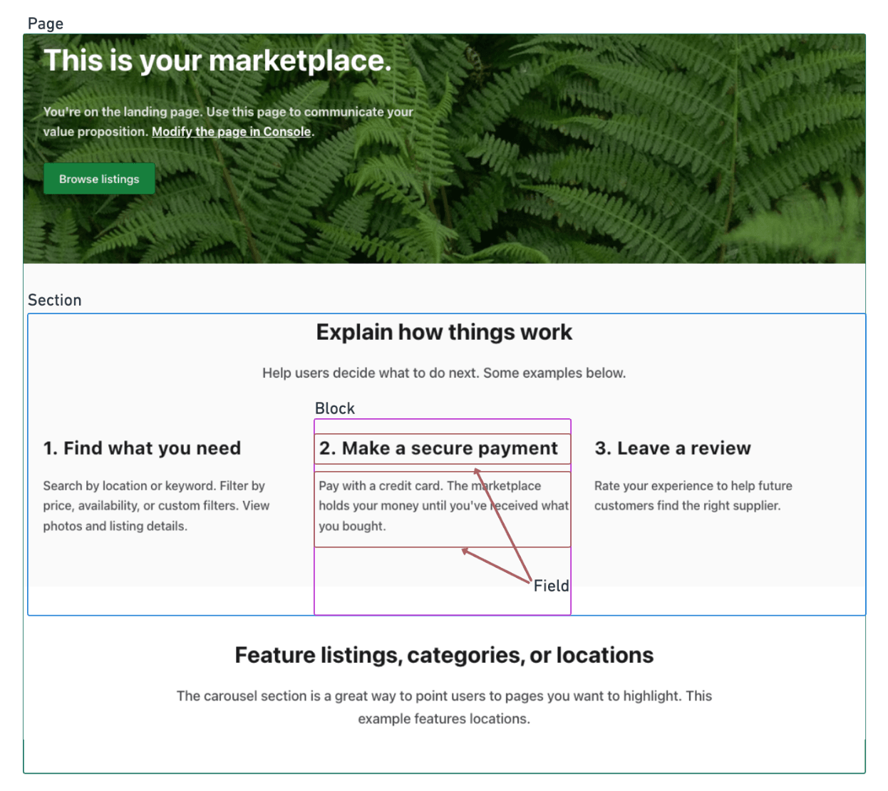 The main element of a page. In Sharetribe, each section has a specific content model that determines the information that the section must have to function properly. Sections can have fields and blocks within them. In Sharetribe, sections are the main way to distinguish pages from each other. Example: article, feature, columns.