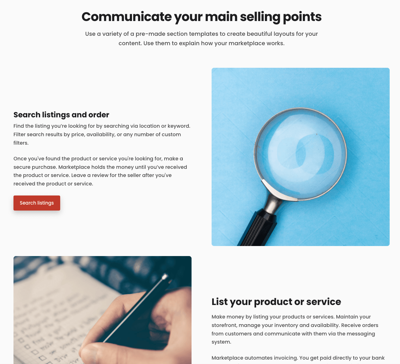 Sharetribe has four default content sections that you can select for your page. All sections have a title, an ingress, and a button for a call to action.