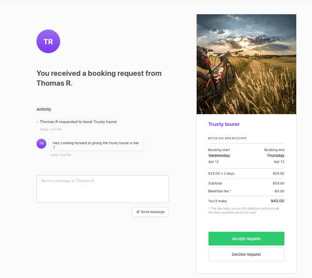 The Sharetribe Web Template starts with a familiarly modern and sleek marketplace design. Each component is built to suit multiple screen-sizes, from desktop to mobile browser. Your email notifications also include the same smooth style out of the box.