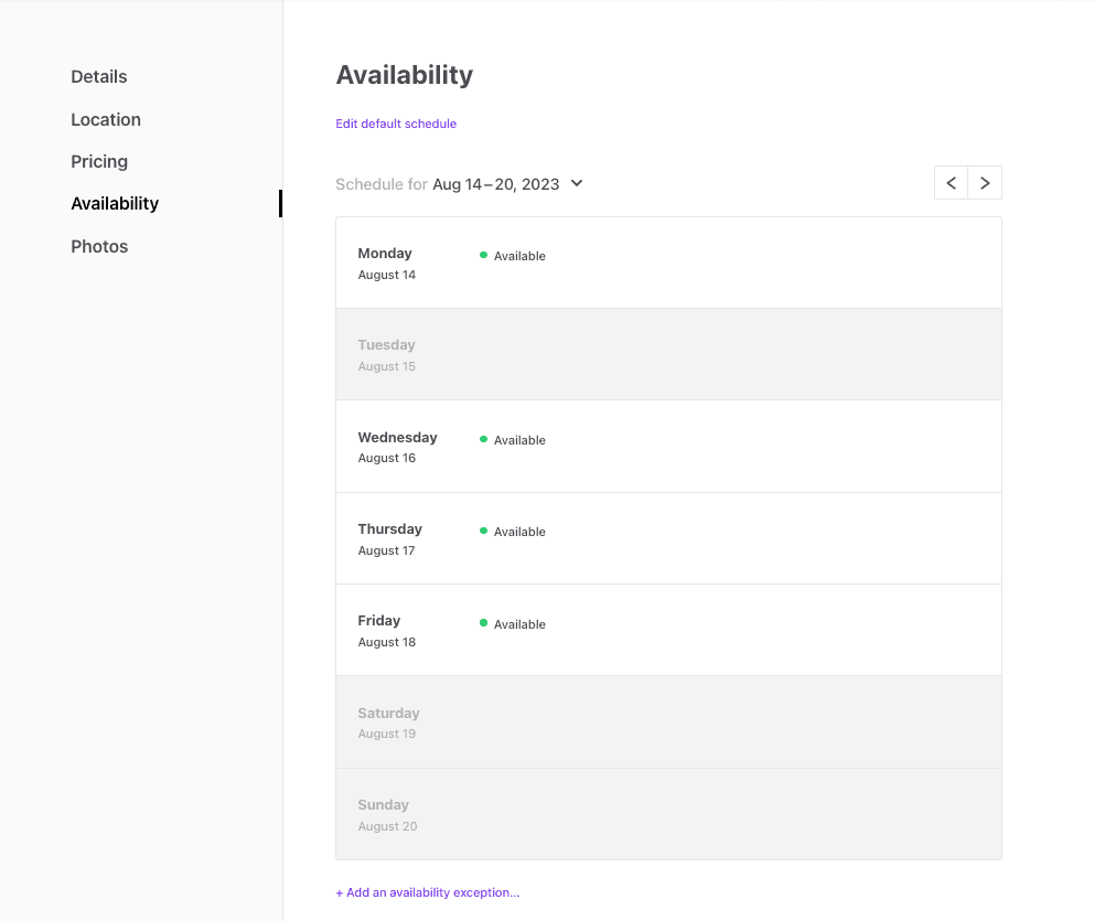 Listing authors add their availability when creating their listing. Daily and nightly availability lets them add a default weekly schedule and easily set any exceptions to that default schedule. Hourly availability lets listing authors set their exact schedule for every day up to one year in advance.